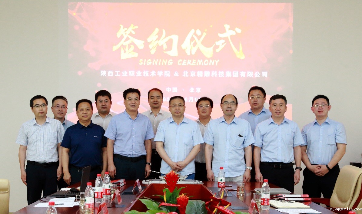 6月5日上午, 我院与北京精雕科技集团有限公司在北京精雕科技集团主楼5号会议室签订战略合作协议。精雕董事长兼总裁蔚飞、执行总裁张保全、运营总监兼职教合作中心总经理于洋、运营总监兼西安研发中心总经理蔡锐龙、西安精雕软件科技有限公司总经理助理王帅,我院院长刘永亮、双高办主任卢庆林、校企合作处处长卢文澈、产教融合研究院院长王建军、机械工程学院院长赵明威、机械工程学院党总支书记苏宏志等相关职能部门负责人参加签约仪式。会议由蔡锐龙主持。